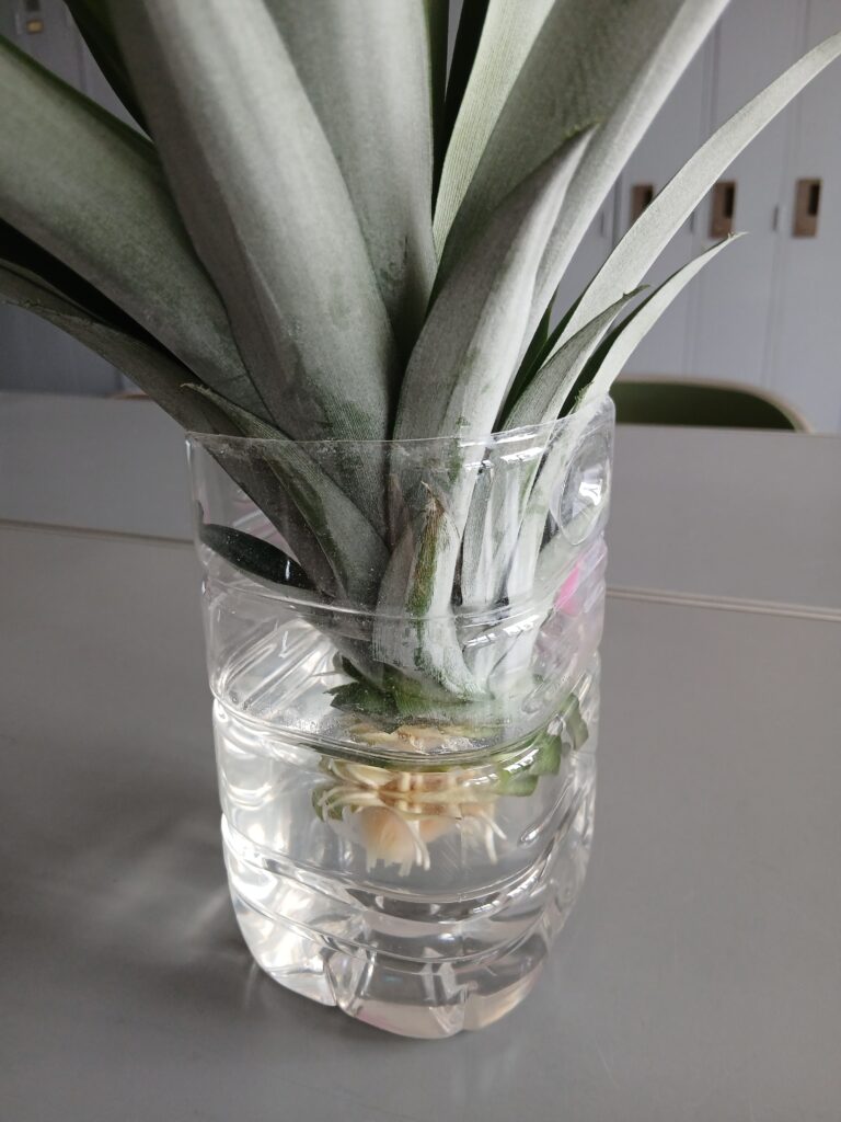 食べ終わったパイナップルのアタマを切って水に浸けておくと根が出るので、土に植え替えて育てると実が生る。