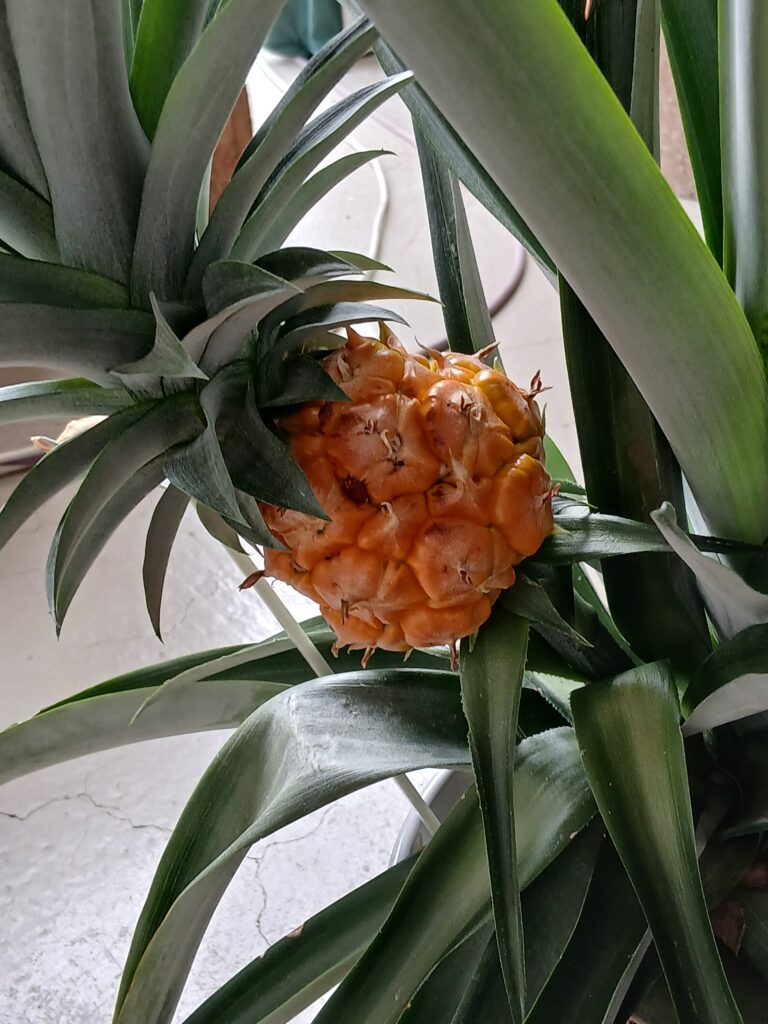 夏の暑い間は青い(茶色い?)ままだったのですが、少し涼しくなり秋めいたある日パイナップルは黄色くなっていました。