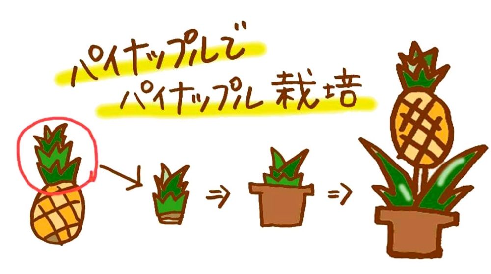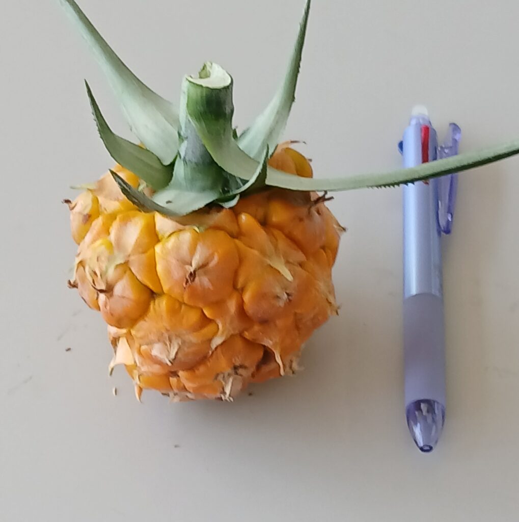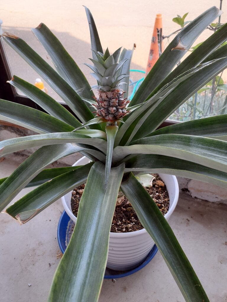 スーパーで買ったパイナップルのアタマ(葉っぱ)部分を植えて自分で育てたそうです。