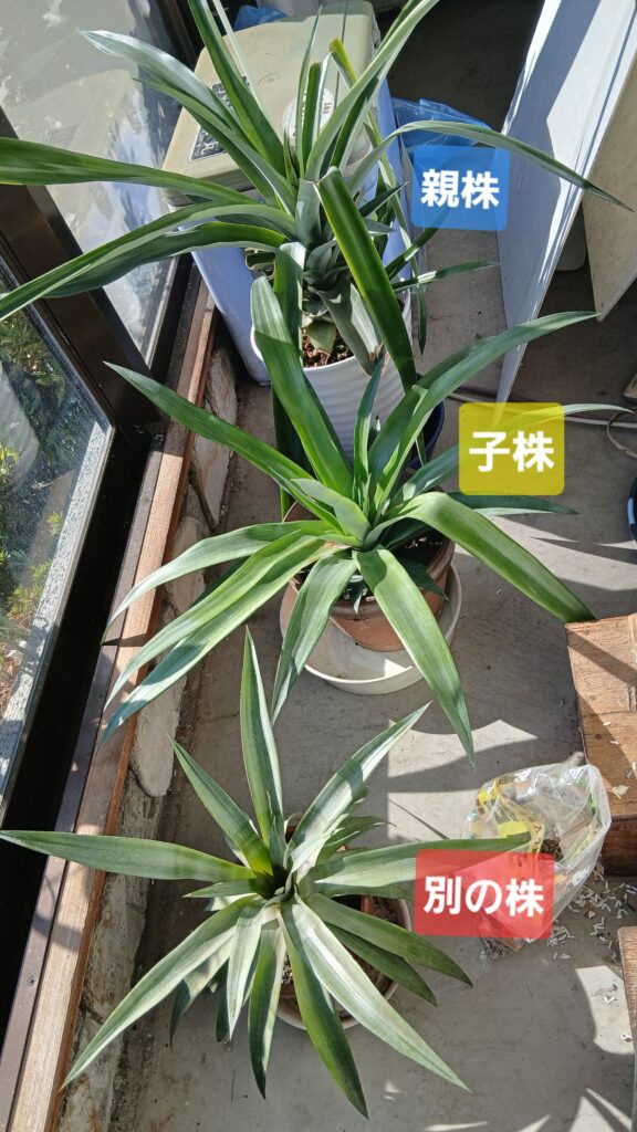 上から親株、子株(今回水栽培から植え替えた株)、そして別の種類のパイナップルです。