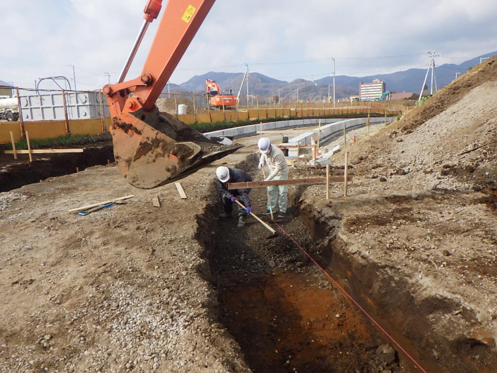 U字溝が据え終わったら路盤を作る為、掘削して行きます。