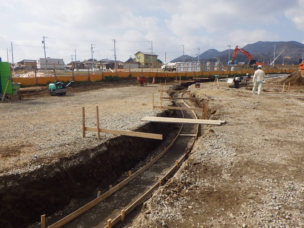 下の写真は、基礎コンクリートを打つ為の、型枠設置状況です。